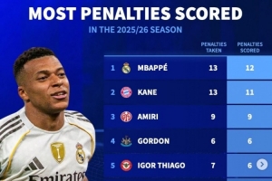 體育資訊2月10日訊 《轉(zhuǎn)會市場》統(tǒng)計(jì)了本賽季五大聯(lián)賽球員點(diǎn)球進(jìn)球情況,姆巴佩力壓凱恩居首。