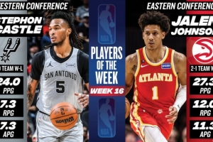 體育資訊2月10日訊 今日NBA官方宣布,馬刺后衛(wèi)斯蒂芬·卡斯?fàn)柡屠销椙颁h杰倫·約翰遜分別被評(píng)本賽季第16周西部和東部周最佳球員。