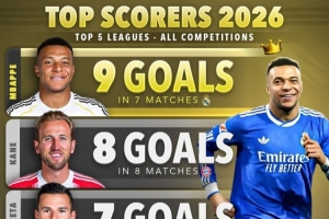 體育資訊2月10日訊 Score90統(tǒng)計了五大聯(lián)賽球員2026年各賽事的進球數(shù)量,并列出2026年進球榜,姆巴佩7場9球居首。