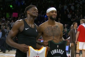 賽后,愛德華茲與前隊(duì)友亞歷山大-沃克互換球衣并合影。