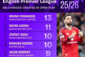 體育資訊2月10日訊 squawka統(tǒng)計了本賽季英超球員在運動戰(zhàn)創(chuàng)造重大機(jī)會情況,曼聯(lián)隊長B費依然領(lǐng)跑。