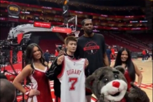 賽前,任嘉倫現(xiàn)身火箭主場,為杜蘭特送上唐裝作為禮物,后者送上簽名球衣+合影留念。