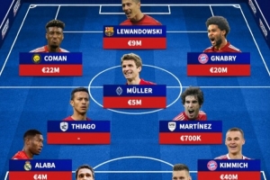 后衛(wèi):阿拉巴(皇馬,400萬)、胡梅爾斯(退役)、聚勒(多特,500萬)、基米希(4000萬)