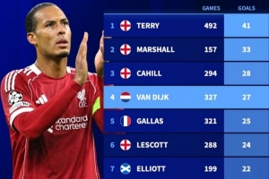 體育資訊2月12日訊 德國轉(zhuǎn)會市場統(tǒng)計(jì)了英超歷史上中后衛(wèi)進(jìn)球數(shù)據(jù)排名,約翰·特里41球居首,范戴克27球第四。