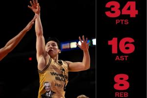 此役,河村勇輝代表風(fēng)城公牛首發(fā)登場出戰(zhàn)40分鐘,24投12中,三分6中3,4罰4中,砍下個人生涯新高的34分16助攻,外加8個籃板(賽季新高)。