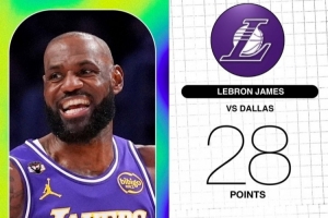 本場(chǎng)比賽,湖人前鋒詹姆斯上場(chǎng)35分鐘,20投10中得到28分10籃板12助攻。