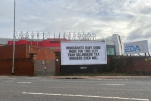 在老特拉福德外,有一個(gè)橫幅這樣寫道:移民對(duì)這座城市的貢獻(xiàn)遠(yuǎn)超那些逃稅的億萬富翁。