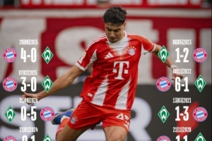 體育資訊2月14日訊 本輪德甲拜仁對(duì)陣不萊梅的比賽即將打響,拜仁官推也曬出兩隊(duì)近10次交鋒戰(zhàn)績(jī)。