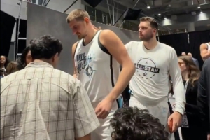 在約基奇給球迷簽名時(shí),東契奇拍子約老師的后腦勺,而約老師則是以白眼回應(yīng)。