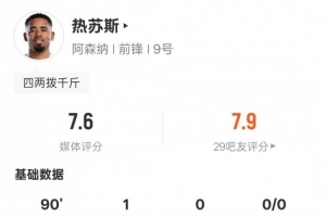 體育資訊2月16日訊 足總杯第4輪,阿森納4-0維岡競(jìng)技。熱蘇斯首發(fā)出戰(zhàn),1射門1射正打進(jìn)1粒進(jìn)球,另外他還有1次過(guò)人成功,但也有16次丟失球權(quán),評(píng)分7.6。