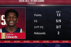 體育資訊2月16日訊 NBA全明星正賽循環(huán)賽2場戰(zhàn)罷,美國新星隊目前1勝1負。