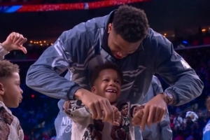 比賽中,倫納德化身戰(zhàn)神卡,字母哥的兒子在場邊豎起大拇指為倫納德加油,作為世界隊(duì)的一員,字母哥趕緊按下兒子的雙手,并教他拇指向下噓。