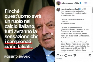 薩維亞諾對馬洛塔的抨擊十分直接,他甚至在 Instagram發(fā)文時配上了馬洛塔的照片。身為那不勒斯死忠的薩維亞諾特意強調(diào),自己的立場與球隊無關,他說:“這不是球衣顏色的問題,也不是體育層面的好惡問題。這不是國際米蘭對陣某支球隊的問題,而是體系的問題。當一份司法裁定明確指出,存在某些‘受控局面’時,這件事就不再是酒吧里的閑聊話題,而是上升到了體制與結構性問題。當意大利足壇面對如此敏感的事件,卻采取選擇性謹慎、集體沉默,或是推出隨后被事實戳穿的官方說辭時,問題就不再是一場比賽的結果。”