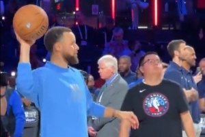 勇士球星庫里因傷高掛免戰(zhàn)牌,但他沒有閑著,在賽前熱身環(huán)節(jié)幫隊(duì)友傳球,十分敬業(yè)。
