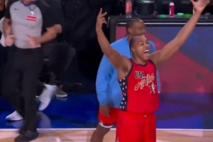 體育資訊2月16日訊 NBA全明星正賽循環(huán)賽,世界隊(duì)加時35-37惜敗美國新星隊(duì)。