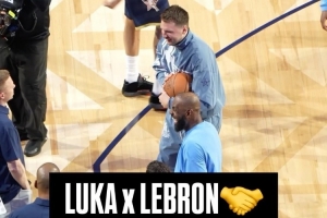 ESPN洛杉磯分部官方Instagram曬出一段比賽期間的花絮:湖人隊友詹姆斯和東契奇在場邊閑聊,詹姆斯還笑著推了東契奇一把。