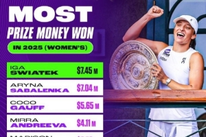 斯瓦泰克本賽季取得了745萬美元的獎(jiǎng)金排名第一,薩巴倫卡704萬美元排名第二,高芙565萬美元排名第三,中國選手鄭欽文無緣該榜單前十。