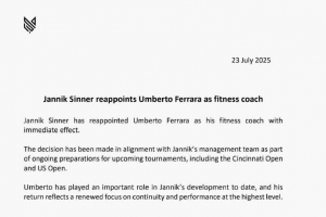 體育資訊7月23日訊 現(xiàn)男子網球世界第一辛納團隊發(fā)表聲明,體能師翁貝托-費拉拉回歸團隊,原來的體能師帕尼奇將加入魯內團隊。