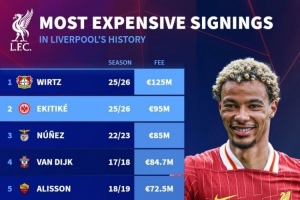 體育資訊7月24日訊 德國(guó)轉(zhuǎn)會(huì)市場(chǎng)統(tǒng)計(jì)了利物浦引進(jìn)新援的費(fèi)用,并列出利物浦隊(duì)史最貴引援榜,維爾茨居首,埃基蒂克、努涅斯二三位。