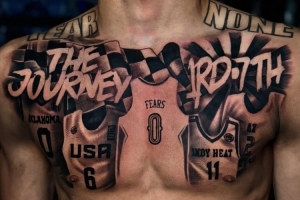 他剛剛為費(fèi)爾斯在胸前加上了一個(gè)紋身作品,圖案是費(fèi)爾斯生涯的那些球衣,其中包括高中、AAU、美國(guó)U系列國(guó)家隊(duì)、俄克拉荷馬大學(xué)還有鵜鶘的球衣。
