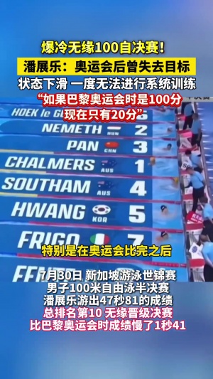 在游不動的時候,他會回想奧運奪冠時的場景來激勵自己。鄭坤良教練則表示潘展樂的體能和專項能力都下降了很多。被問及狀態(tài)恢復(fù)情況,潘展樂說如果巴黎奧運會時是100分,現(xiàn)在只有20分。