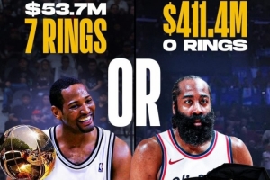 詹姆斯-哈登的(薪資)收入已經(jīng)超過了4.11億美元,但NBA生涯至今冠軍數(shù)仍是0。