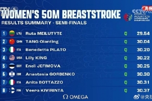 體育資訊8月2日訊 2025年世界泳聯(lián)世錦賽女子50米蛙泳半決賽,唐錢婷游出30秒04的成績,以總成績第二晉級決賽,楊暢排名第16無緣決賽。