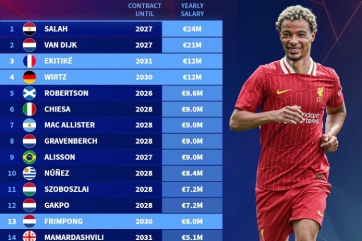 利物浦隊(duì)內(nèi)年薪排行↓