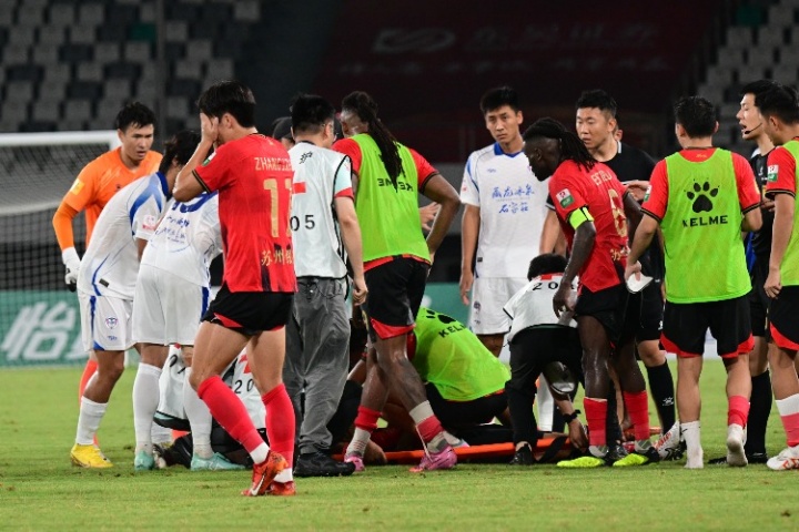 今晚中甲第20輪,蘇州東吳1-1石家莊功夫。比賽第92分鐘,比賽突發(fā)狀況,蘇州東吳球員胡靖突然倒地。救護(hù)車(chē)緊急入場(chǎng),醫(yī)護(hù)人員現(xiàn)場(chǎng)心肺復(fù)蘇,隨后球員被救護(hù)車(chē)?yán)呔戎巍?/p>