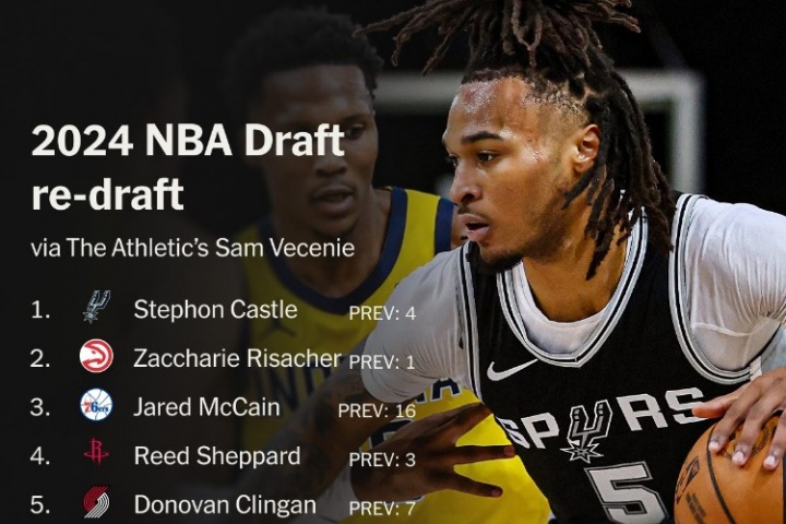 體育資訊08月15日訊 TA記者Sam Vecenie重排了2024年選秀前十,以下是詳細情況: