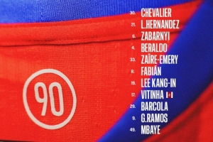 30-舍瓦利耶 、21-盧卡斯、6-扎巴爾尼、4-貝拉爾多、33-埃梅里、8-法比安、19-李剛仁、17-維蒂尼亞、29-巴爾科拉、9-貢薩洛-拉莫斯、49-姆巴耶