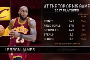 這是詹姆斯17年季后賽前七場的場均數(shù)據(jù),騎士7勝0負。