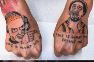 體育資訊8月22日訊 近日,一位步行者球迷將哈利伯頓在今年季后賽鎖喉慶祝以及雷吉-米勒的照片分別文在了自己的雙手背上。