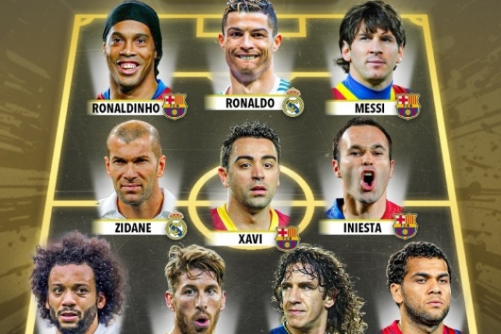 中場:齊達內(nèi)(皇馬)、哈維(巴薩)、伊涅斯塔(巴薩)