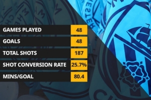 Opta統(tǒng)計了哈蘭德在英超主場比賽的進球數(shù)據(jù),他出戰(zhàn)48場英超主場比賽,打進48球,而英超歷史唯一在少于50場主場比賽中打進50球的是希勒,他只用了47場比賽。