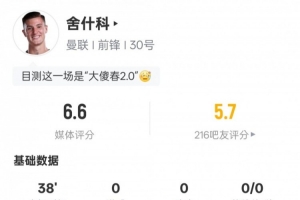 體育資訊8月25日訊 2025-26賽季英超第2輪,曼聯(lián)客場1-1富勒姆。舍什科替補出戰(zhàn),多項數(shù)據掛零,只有2次爭頂均成功。