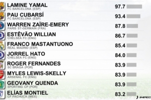 體育資訊8月28日訊 CIES(瑞士足球天文臺(tái))評(píng)出今年非門將U20球員的表現(xiàn),亞馬爾成為評(píng)分最高的球員,庫(kù)巴西第二。