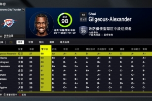 體育資訊8月30日訊 今日NBA 2K26正式發(fā)布,雷霆隊(duì)球員能力值如下:
