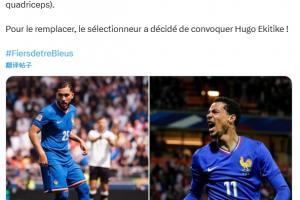 法國隊(duì)官方宣布:由于謝爾基股四頭肌撕裂,主教練德尚決定征召?;倏巳脒x本期國家隊(duì)。