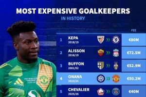 體育資訊9月9日訊 德國轉(zhuǎn)會市場統(tǒng)計(jì)了門將的轉(zhuǎn)會費(fèi),并列出榜單,凱帕8000萬歐居首,阿利森、布馮、奧納納排名前四。