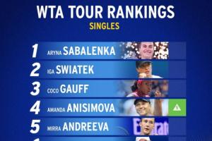 美網(wǎng)奪冠的薩巴倫卡穩(wěn)居世界第一,斯瓦泰克和高芙分列二三,阿尼西莫娃上升5位至第4,傷缺美網(wǎng)的鄭欽文下跌2位至第9。