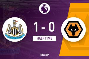 上半場比賽結(jié)束,紐卡斯?fàn)柭?lián)1-0狼隊。