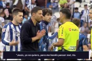 比賽第32分鐘,皇家社會(huì)反擊機(jī)會(huì),赫伊森犯規(guī),主裁判曼薩諾果斷出示紅牌。轉(zhuǎn)播方拍到了皇馬主帥阿隆索與裁判曼薩諾溝通的內(nèi)容。