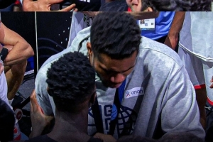 賽后,在場邊觀戰(zhàn)的字母哥和施羅德?lián)肀е乱狻?/p>