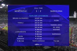 體育資訊9月19日訊 紐卡對陣巴薩的歐冠首輪比賽結(jié)束,最終紐卡1-2輸給巴薩,全場比賽的跑動數(shù)據(jù)也已經(jīng)公布。