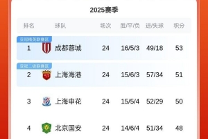 目前成都蓉城積53分居榜首,上海海港積51分位列次席,上海申花積50分排第三,北京國安積48分排第四。