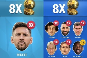 1.法國(guó) 8次(普拉蒂尼x3 本澤馬、齊達(dá)內(nèi)、帕潘、科帕、登貝萊x1)