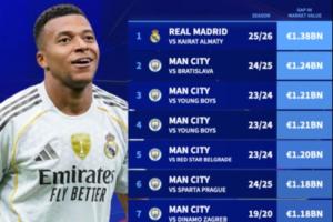 歐冠歷史身價(jià)差距最大比賽排行↓(本賽季阿森納對(duì)陣凱拉特交鋒也將躋身榜單,但由于球員身價(jià)將在后續(xù)更新中調(diào)整,故暫未列入本次統(tǒng)計(jì))