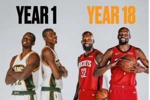 體育資訊10月1日訊 今天,美媒BasketBallForever曬出了杜蘭特與杰夫-格林的新秀賽季定妝照,并與今年兩人的定妝照做了對比。
