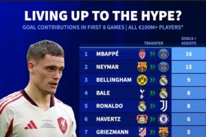 德轉(zhuǎn)“惡趣味”地統(tǒng)計(jì)了轉(zhuǎn)會費(fèi)上億歐元的攻擊手們?yōu)樾虑蜿?duì)出戰(zhàn)前8場比賽,在進(jìn)球+助攻上的貢獻(xiàn)榜單。姆巴佩、內(nèi)馬爾、貝林厄姆分列前3,而最后一名可謂是為了這碟醋才包的這盤餃子...